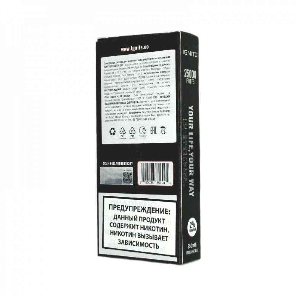 Технические характеристики Электронная сигарета Ignite V250 Black 25000 затяжек - Pineapple Kiwi Dragon Fruit (Ананас киви драконий фрукт)